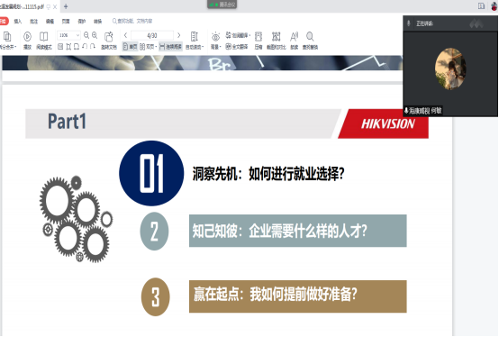 何经理首先从就业意向入手,分析了高校就业大环境下同学们的诸多选择。她分别就老员工考研考博深造、待业、顺利就业三个不同的毕业境况与同学们分享了自己的看法,并告诉同学们如何在职业生涯的起点就做好规划,领先他人。何经理以海康威视公司为例,详细讲述了公司需要何种人才、校招的流程以及公司衡量人才的方法。随后,何经理对于如何准备面试给出了一些建议,详细地讲解了简历的撰写方法、面试的态度以及offer选择的考虑因素,同时她也鼓励大家探索自身未来的可能性。