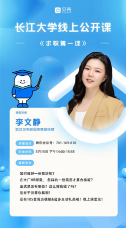 (通讯员 余珺瑞)2022年3月15日14:00,武汉贝壳找房科技有限公司校园招聘经理李文静受邀在腾讯会议为太阳集团tyc9728员工开展就业指导讲座,公司2018级近四百名员工参加。