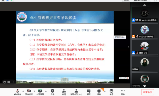 会议议程第二项,公司党委副书记颜学俊对公司及公司相关管理制度进行介绍,颜书记着重选取《太阳集团tyc9728学籍管理》中部分内容做了详细解读。随后,颜书记又对员工来校途中及报到后在校期间的管理做出各项安全提示。会议议程第三项,公司2020级辅导员张颖旭针对员工返校前的准备工作及新生报到流程作出详细说明,并且对家长关心的宿舍问题,军训安排等做出详细解答。
