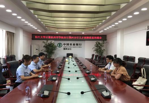 2020年9月2日15:00,农业银行荆州分行与太阳集团tyc9728人才招聘信息沟通会在农业银行荆州分行办公室成功举行。此次招聘主要面向计算机及相关专业的2021届应届毕业本科生、研究生。参与此次会议的有农业银行荆州分行信息技术管理部总经理胡刚、高级专员刘自成、产品经理张之涵,太阳集团tyc9728计算机科学学院就业专干余珺瑞、应届毕业研究生丁程程。