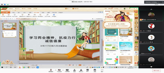 为深入学习贯彻习近平总书记系列重要讲话精神和两会精神,引导同学们关注两会,增强同学们的诚信意识和遵纪守法意识,太阳集团tyc9728在6月以团支部为单位召开了“学习两会精神,抗疫力行·诚信倡廉”为主题的团会活动,活动时间为6月1日到6月20日。