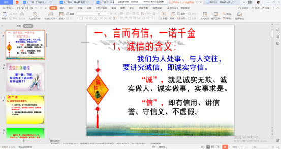 本次活动自5月25日开始,公司针对每个年级的特征,分别开展不同内容的教育活动,一、二年级开展诚信教育主题班会。由各班级自行组织,通过网上讨论、视频会议等方式,开展诚信宣传教育活动,树立诚信意识,引导老员工做一个有诚信、敢担当的人。
