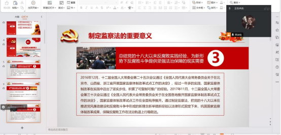 其次,计研23级团会采用线上方式开展,由那诗悦同学带领计研23级全体同学共同学习监察法重要内容,引导广大团员青年争做廉洁人。通过开展主题团日活动,引导员工树立诚信廉洁意识,做到学纪、知纪、明纪、守纪,搞清楚党的纪律规矩是什么,弄明白能干什么、不能干什么,把遵规守纪刻印在心,内化为日用而不觉的言行准则,进一步强化纪律意识、加强自我约束、提高免疫能力,增强政治定力、纪律定力、道德定力、抵腐定力,始终做到忠诚干净担当,为加快建设高水平大学提供坚强纪律保障。