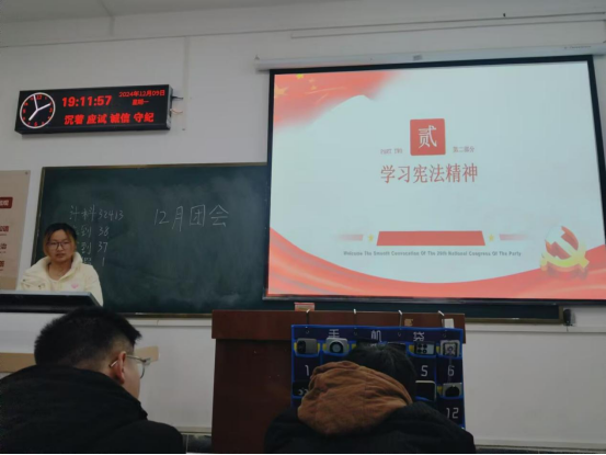 接着,张冬梅同学带领计科32413班阅读并理解习近平对新时代马克思主义理论研究和建设工程的重要指示强调,深入浅出地讲解了马克思主义理论研究和建设工程是党的思想理论建设的基础工程、战略工程,让同学们有了更深入的了解和思考。除此之外,随着12月4日第十一个国家宪法日的到来,她也用视频让同学们了解并学习宪法精神,视频生动而全面的讲解,不仅充分调动了同学们的积极性,还加深和拓宽了他们的印象与视野。