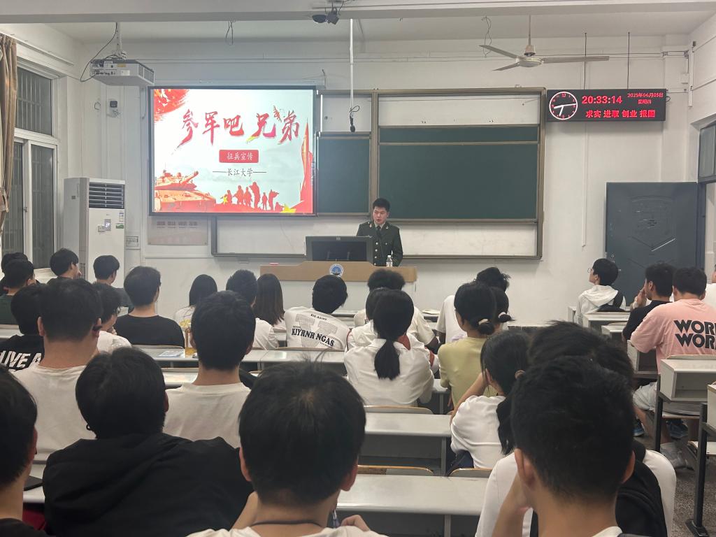 2025年6月5日晚7点,太阳集团tyc9728在东校区13教B-402举行“青春铸盾·代码报国”征兵宣讲。征兵专干郭帅老师、退伍老员工代表及2021级60余名同学到场,辅导员郭帅主持活动。