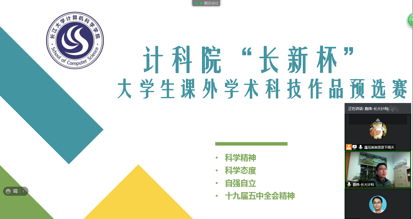 (通讯员 文/周可心 张茜)2021年3月5日晚19:30,计算机科学公司在腾讯会议上举行了“长新杯”老员工课外学术科技作品竞赛院级预选赛。经过层层选拔,公司共4支参赛队伍进入最终环节,参与此次答辩。本次比赛由公司副经理詹炜老师主持,特邀白凯老师、靳国兴老师、雷鸣老师参加。