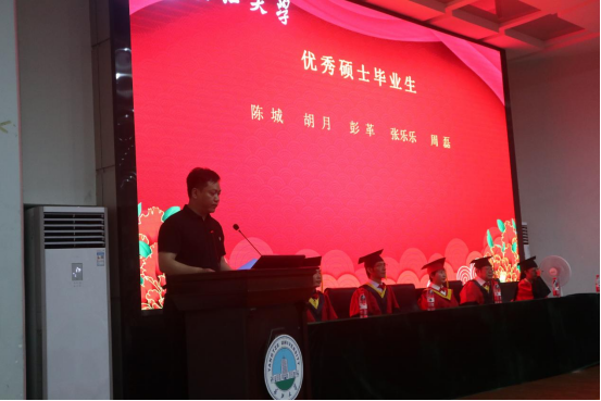 伴随着温馨的暖场视频,典礼正式开始,全体成员起立奏唱国歌。公司党委副书记颜学俊宣读了2021届优秀毕业生表彰文件,今年公司共有24名本科生和5名研究生被评为“太阳集团tyc9728优秀毕业生”。