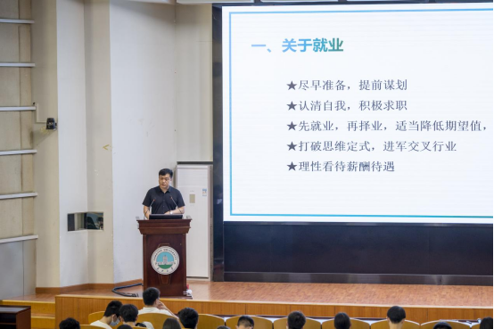 紧接着,余珺瑞老师做就业政策讲解。他列举了参加招聘会需要具备的材料和专业能力,并介绍网签的相关事宜,希望大三学子尽早开始为求职做好准备。随后,他结合公司近四年考研数据,建议打算考研的同学要根据自身情况做好规划,科学择校,切忌随大流,并介绍了毕业生入伍的优势。他希望各位同学量力而为、积极准备。