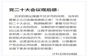 计科12003班余宗懋习:习近平总书记在二十大报告中强调,到二〇三五年,我国发展的总体目标之一是建成教育强国、科技强国、人才强国、文化强国、体育强国、健康中国,国家文化软实力显著增强。二十大标志着高等教育高质量发展进入快车道,越来越多的学子将会得到更全面、更多样、更高质的教育资源。作为一名员工干部,我将继续努力学习,练就过硬本领;踏实工作,服务师生,为公司建设尽一份力,为祖国发展时刻准备!