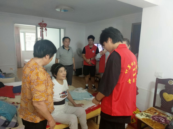 包粽子活动结束后,志愿者并未离开,而是等待着粽子煮熟,进行下一个任务。在十方庵社区,有14户“五保”居民,志愿者们要将节日的温暖传递给他们。在社区工作人员的带领下,志愿者带上粽子,上门看望这些特殊困难家庭。每到一户,志愿者热情地与他们交谈,在送上节日的祝福同时了解他们的身体状况以及目前存在的困难或需求,并叮嘱他们要保重身体。待返回社区后,志愿者将每户的情况整理成纸质材料,及时反馈给社区。