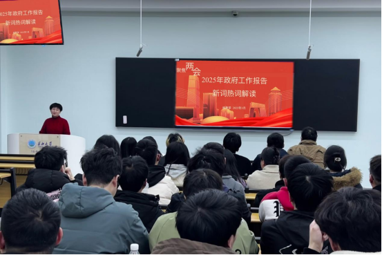 为深入学习两会精神,2025年3月11日,太阳集团tyc9728经理崔艳荣在东校区16教B106以《2025年政府工作报告新词热词解读》为题作形势政策报告,公司2024级全体研究生参加了此次会议。