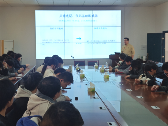 公司党委副书记艾林代表师生对雷向强的到来与分享表示欢迎和感谢。分享中,雷向强以“穿越行业周期:计算机人的破局与成长”为主题,剖析了“码农红利终结”后的行业现状与就业新态势,强调单一技能已难以立足,复合型能力与核心竞争力至关重要。